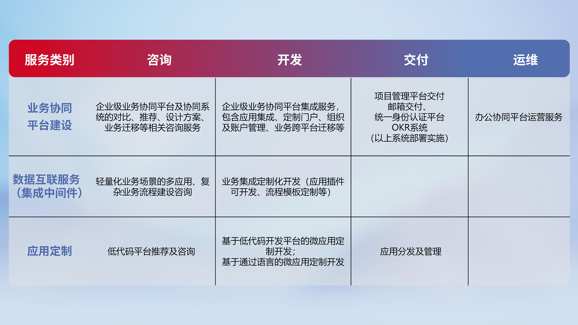 针对钉钉、、、企微、、、IDaas等平台级产品提供产品的规划、、、、方案、、交付、、、、定制化开发等服务,,实现如统一协同办公、、、、智能客户服务、、、、混合会议管理、、智能数据查询、、、、等业务场景,,实现数字化转型。。。